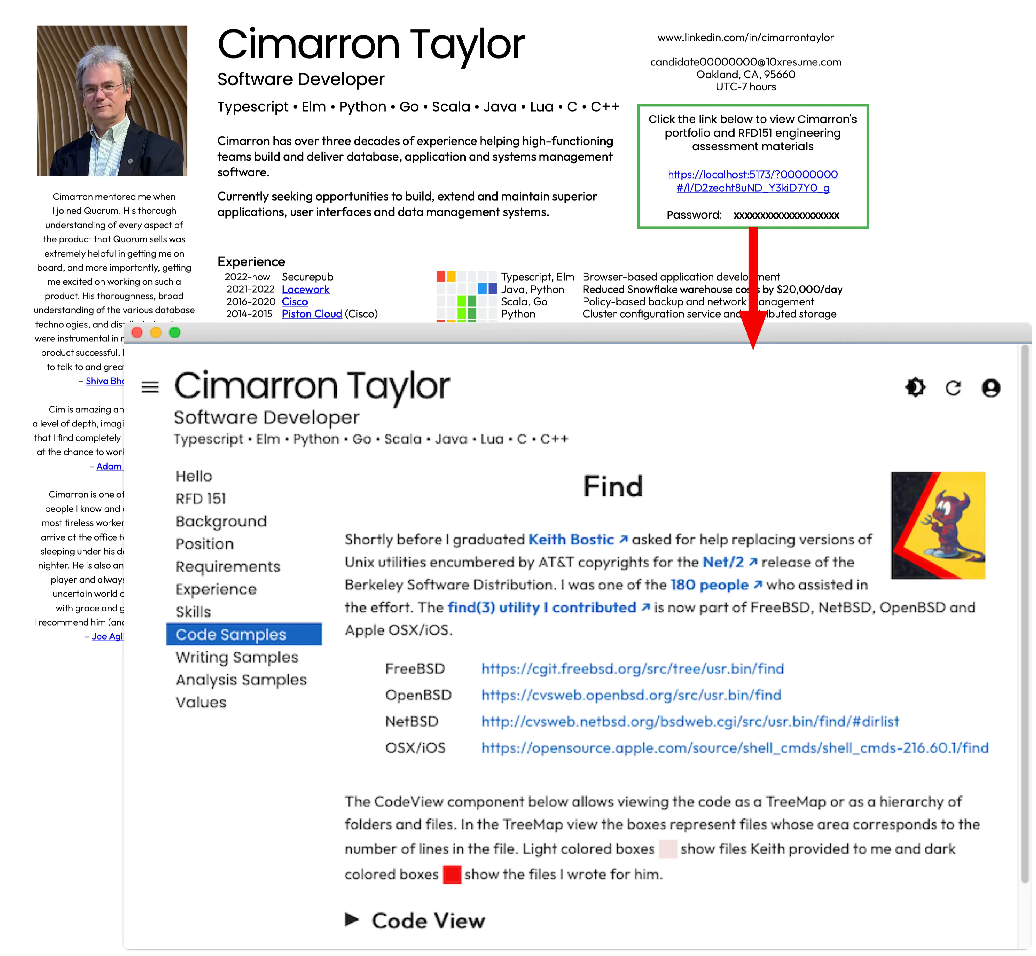 Publish your encrypted portfolio with Userbase. Register it with 10x Resume. Only those with a link and password you control can see your portfolio. No service provider or infrastructure operator can access to your content.